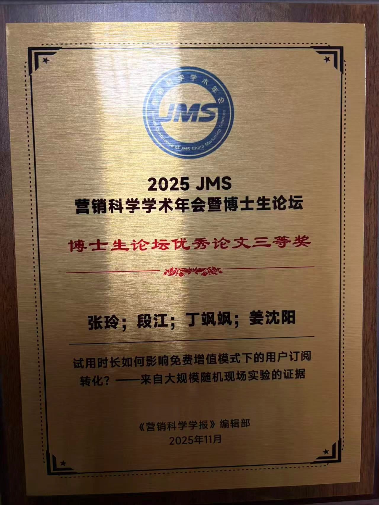 篇获奖论文分别来自北京大学、复旦大学、南京大学、yl23411永利官网登录、上海财经大学和香港中文大学,涵盖了人工智能营销、消费者行为、数字化创新与品牌管理等多个前沿领域,充分展示了国内青年学者在科研创新与学术深度方面的卓越表现。在博士生论坛评选环节中,段江教授指导的博士生张玲同学凭借论文《试用时长如何影响免费增值模式下的用户订阅转化?——来自大规模随机现场实验的证据》,荣获博士生论坛优秀论文三等奖。该论文基于超大样本随机实验数据,深入分析了不同试用期长度对
